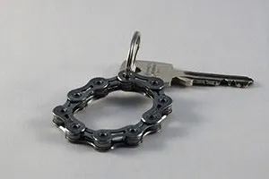 de sleutelhanger gemaakt van fietsketting schakels. Voordat de kettingschakels van een afgedankte fietsketting geschikt zijn als sleutelhanger worden deze eerst grondig ontvet en daarna met de hand gepolijst. Een leuke hebbedingetje voor een fietsliefhebber!