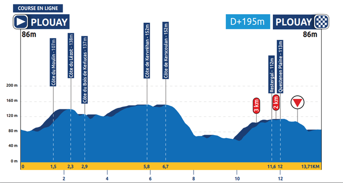 EK wielrennen kunnen de renners maar beter hun klimmersbenen onderschroeven, al lijkt het parcours ook zeer geschikt voor de klassiekerspecialisten. Op 26 augustus rijdt het peloton in totaal dertien rondes over een lokaal parcours rond Plouay. In dit lokale rondje wordt telkens de Cote du Lezot en de Restergal beklommen. Beide klimmetjes zijn zo'n kilometer lang en rond de vijf procent stijging gemiddeld. De finish ligt na een korte afdaling.