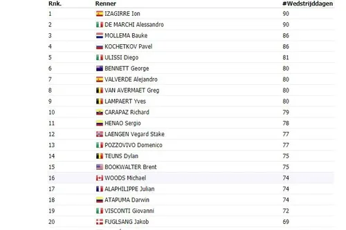 Alessandro De Marchi staan in de top tien met 90 koersdagen. Mollema vinden we terug op plaats 19, want hij koerste 86 dagen in 2018.