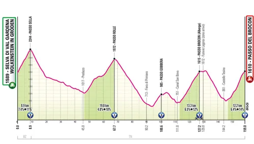 Giro d'Italia 2024 is opnieuw enorm zwaar. In totaal moeten de renners over 159 kilometers meer dan 4.200 hoogtemeters overwinnen. De start is in Selva di Val Gardena en het peloton moet gelijk aan de bak. De Passo Sella is 8,9 kilometer lang en stijgt gemiddeld met 7,4%. Een stevige opwarming dus voor wat nog komen gaat. Na een lange afdaling is het de beurt aan de Passo Rolle. Deze klim is maar liefst 19,8 kilometer lang met een stijgingspercentage van 4,8%. Vervolgens wordt er weer gedaald en is het tijd voor de derde grote klim van de dag. De Passo Gobbera is met 5,8 kilometer à 5,8% het volgende obstakel op dit loodzware parcours. De laatste beklimming van de dag is die van de Passo del Brocon. Deze moet wel twee keer overwonnen worden. De oostelijke beklimming is de eerste en is 15,4 kilometer lang. De tweede keer is de beklimming 11,9 kilometer lang met een gemiddelde stijging van 6,5%. De finish ligt bovenop de Brocon.