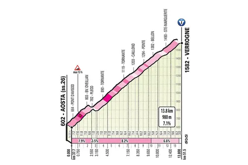 Over 131 kilometer gaat het in het uiterste puntje van Italië, aan de grens van Frankrijk en Zwitserland, van Saint-Vincent naar Courmayeur. Zoals eerder vermeld: onderweg zijn er vier cols en ook aan de finish is het niet vlak. De renners zullen moeten opwarmen op de rollen, want er is maar 7 kilometer af te leggen voor de eerste klim begint: de Verrayes. 6700 meter lang aan 8 procent, met maximale stijging van 13 procent, is een lekkere binnenkomer. Na de afdaling is het 15 kilometer vlak naar de volgende col en dat is een flinke.