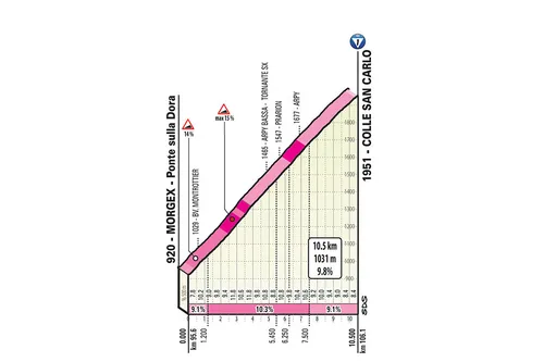 Tegen de Truc d’arbe zal het minst worden opgezien. Na een afdaling van zes kilometer is er een moment van rust, al ligt er nog een klein puistje in de vorm van La Salle. Maar dat is niets vergeleken met de machtige Colle San Carlo. Niet alleen lang met zijn 10.5 kilometer, het gaat ook geen moment rustig aan. Het grootste gedeelte van de klim gaat aan stijgingspercentages van boven de tien procent, met pieken tot 15 procent. De eerste kilometer is gemiddeld nog 9.1 procent, daarna volgen 6500 meters aan 10.3 procent gemiddeld. De laatste drie kilometer is wederom 9.1 procent gemiddeld. Alles en iedereen zal hier uit elkaar worden geslagen.
