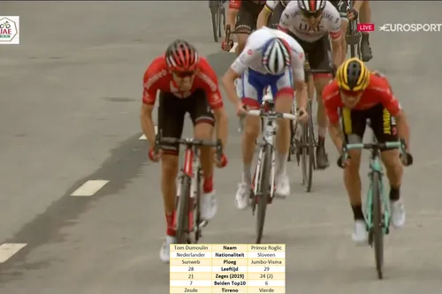 Toch is de kans groot dat er pas echt een beslissing valt in de afsluitende tijdrit (dinsdag). Een onderdeel waarop ze ook in de Giro veelvuldig met elkaar de strijd zullen gaan. Hoewel ze beiden wereldtop zijn, is Dumoulin toch vrijwel altijd de betere in races tegen de klok. De enige tijdrit dit Roglic ooit heeft gewonnen, terwijl Dumoulin aan het vertrek stond was die van de Giro van 2016. Een verregende, heuvelrijke tijdrit van ruim veertig kilometer, waarin Dumoulin matige prestatie leverde. Hij werd vijftiende op bijna twee minuten. Achter bijvoorbeeld Maarten Tjallingii en Peter Serry. Maar tijdens de recente grote afspraken heeft Dumoulin toch altijd de overhand gehad. En deze tijdrit in de Tirreno mogen we toch wel de eerste grote afspraak van 2019 noemen. (foto: screenshot Eurosport)