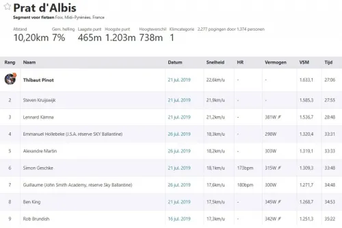 Op de voorlaatste klim, de Col de Peguere, zien we Laurens De Plus als snelste man boven komen op Strava. Daarna is het aan Pinot. Op de Prat d'Albis, van 10,2 kilometer aan zeven procent, rijdt Pinot opnieuw het bestaande record op Strava uit de boeken. 27 minuten en 6 seconden, langer duurde het niet voordat Pinot boven was in de regen. Kruijswijk zien we er nu op een tweede plaats, met 27:55 minuten 49 tellen langzamer dan zijn Franse rivaal.