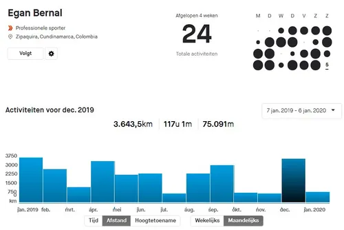 Bernal reed alleen in december al 3.643,5 kilometer. In zes dagen januari staat de teller alweer op 858,7 kilometer. Dat is bij elkaar 4.502,2 kilometer. Zou onze jonge Tourwinnaar misschien een oogje hebben op de races in het voorjaar? Hij rijdt in ieder geval al met gemak ritten van 200+ weg. 219 en 234 kilometer, alleen al in zijn eerste week van 2020. Hallo nieuwjaar!
