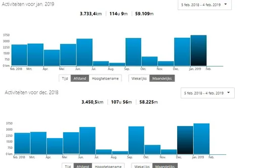 En alsof januari nog niet genoeg was: Onderstaande tabel geeft mooi weer dat het balkje qua kilometers bij Bernal in de afgelopen twaalf maanden niet hoger kwam dan in januari 2019. Wat hier ook opvalt; in december 2018 was Bernal qua kilometers en hoogtemeters bijna net zo bedrijvig als in januari met 58.225 meter. Dat is een totaal over twee maanden van 117.334 hoogtemeters! Niet 6,7, maar 13,2 keer de Mount Everest. Of 110 keer de Alpe d'Huez, 733 keer de Cauberg of van noord-Groningen naar Zwolle rijden, alleen dan verticaal omhoog...