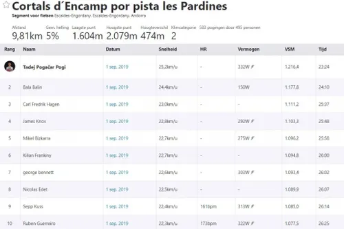De waarschuwing werd gevolgd door een waanzinnig knappe ritzege in de chaotisch verlopen negende etappe. Het was op Andorra hondenweer, de beelden vielen zelfs even weg, concurrenten gingen tegen de grond, maar Pogacar fietste solo keihard door. Op de onregelmatige slotklim, op Strava 'Cortals d´Encamp por pista les Pardines' genoemd, sloeg hij zijn slag. Pogacar reed 9,81 kilometer aan 332 watt gemiddeld, met een piek van 783 watt. Hij reed er 46 seconden harder dan Alejandro Valverde, met een dikke KOM tot gevolg.