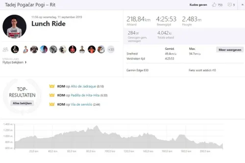 En dan moest één van de mooiste sportprestatie van 2019 nog komen. Pogacar ging de twintigste etappe in als nummer vijf en speelde all-in in de laatste bergrit. Hij vertrok op een krappe veertig kilometer van het einde en leverde daar een buitengewone prestatie. Op de Pena Negra reed hij anderhalve minuut weg van de favorieten en die voorsprong gaf hij in de dertig kilometer daarna niet meer weg. Selecteren we in Strava die laatste 35 kilometer vanaf de voet van de klim, dan zien we een gemiddelde van 34,7 kilometer per uur in de loodzware finale. Daarvoor trapte Pogacar 322 watt weg. Maximaal reed hij hij 73,8 kilometer per uur en 855 watt. Een derde ritzege, de witte trui en een derde plaats in Madrid waren meer dan verdiend.