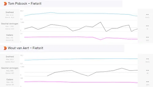 Met onder meer Dylan Teuns en Benoit Cosnefroy roerden grote namen zich al vroeg in de koers. Van Aert en Pidcock begonnen eraan op de Hertstraat, twee rondes voor het einde. Met ook Matteo Trentin in het wiel, stoven ze weg op de kasseienklim. De 720 meter aan 4,9 procent gemiddeld werd gerond in 1.06 minuten, aan een gemiddelde van 39,3 kilometer per uur! Daarmee reden Picock en Van Aert de KOM uit de boeken, die sinds 2020 op naam stond van Amaury Capiot. De Belg deed dat vorig jaar aan zo'n 9,4 watt per kilogram gemiddeld. Het geeft een beetje inzicht in hoe ongelofelijk hard Picock en Van Aert er van weg reden.