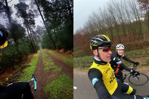 Maar er moest ook hard gewerkt worden in de afgelopen week. Waar de meeste renners druk waren met de zonnebrand in het zuiden van Europa of zelfs in andere werelddelen, daar trok Gesink juist van Girona naar het koude Winterswijk. En zoals gezegd; zijn camera zat als trouwe adjudant in de achterzak. Dat leverde schitterend plaatjes op, bijvoorbeeld toen hij op 4 december richting de Posbank trok. De herfst-kleuren tekenen mooi af met het geel en zwart van de Nederlander (zie hoofdfoto).