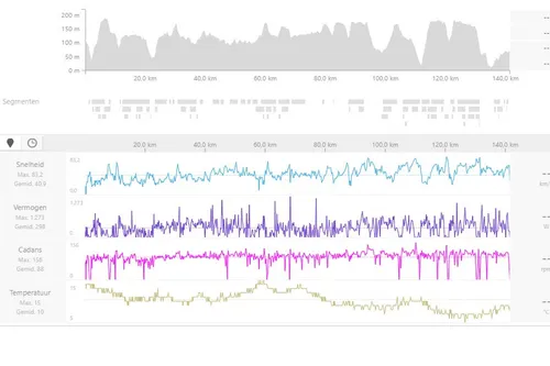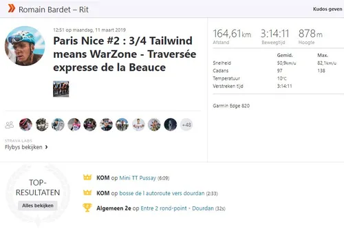 In de eerste etappe was de voorste groep waarin werd gesprint nog het grootst. Zestig renner eindigden in dezelfde tijd, maar vanzelf ging dat niet. Oliver Naesen was op plek twaalf de beste geplaatste, actieve Strava-gebruiker. De snelle cijfers: 141,5 kilometer afgelegd in 3.27 uur, tegen een gemiddelde van 40,9 kilometer per uur. Vooral het gemiddelde vermogen van 340 watt valt op, want dat is flink voor een ritje in het peloton.