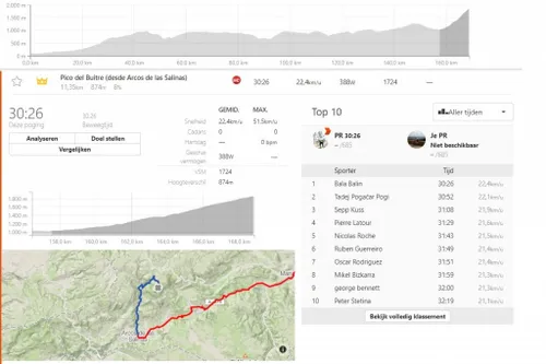 Wat zit er nog in het vat voor de 39-jarige Valverde? Getuige zijn prestatie op de Javalambre mogen we nog wel het één en ander verwachten. Valverde reed de KOM op die zogenaamde Pico del Buitre overtuigend uit de boeken. Hij beklom de pukkel van 11,35 kilometer aan 8 procent gemiddeld in slechts 30.26 minuten. Lopez was er overigens wel iets sneller, maar de Colombiaan heeft geen Strava.