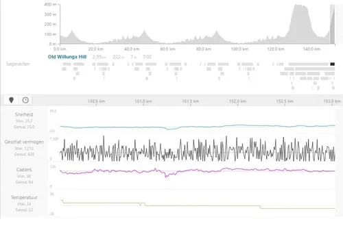 Kijken we naar bijvoorbeeld nummer zes Chris Hamilton, dan zien we wat een inspanning kan doen met de benen. Waar Impey de aanval van Porte in de slotfase alsnog kan beantwoorden, daar zien we bij Hamilton juist een flinke dip die hij ternauwernood te boven komt. Hamilton probeert wél mee te gaan met Porte, gaat flink in het rood en dat moet hij bekopen. Hij valt terug naar bijna 22 kilometer per uur, waarmee de leiders in de wedstrijd snel uit zicht zijn. Met een mooie eindsprint finisht hij op zes seconden. Klimmen doet rare dingen met een mens.