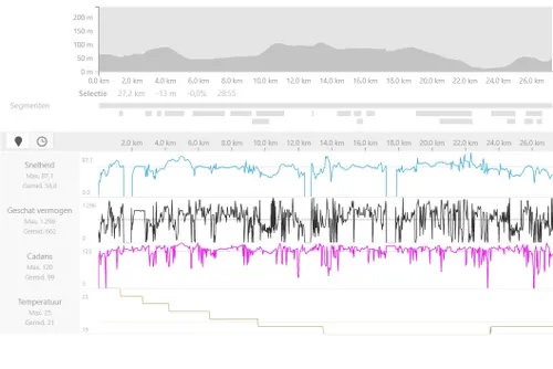 De maximale snelheid van Teunissen lag zondag maar liefst op 87,1 kilometer per uur. Zijn geschatte vermogen lag gemiddeld op 662 watt, met een piek van 1.296 watt. Waarschijnlijk vliegt Strava hier wat uit de bocht met het feit dat het om een ploegentijdrit ging. Het gemiddeld geschatte vermogen van ploegmaat Van Aert lag in de tijdrit namelijk op op 367; een stuk realistischer.