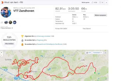 In oktober keken we nog blij naar een rit van 80 kilometer, waarvan hij helemaal kapot thuis kwam. Van Aert ramt inmiddels weer dik honderd kilometer weg op een goede dag. Bovendien dook hij voor het eerst het veld weer in. Het begon op 1 november met een eerste testrit op zijn Bianchi-crossfiets, maar inmiddels is hij weer serieus aan het werk. Op 24 november knalde Van Aert 83 kilometer lang op de mtb. Lekker man!