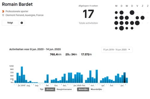 We gaan terug naar 11 mei 2020. Bardet mocht op die dag in Frankrijk voor het eerst in krap twee maanden weer naar buiten in coronatijd. Hij nam het er meteen goed van. In vier weken reed hij 2.146 kilometer en zo'n 42.000 hoogtemeters op de teller. Dat zetten we even in perspectief: Steven Kruijswijk kwam tot dik 1.700 kilometer en 34.000 hoogtemeters, landgenoot Thibaut Pinot noteerde juist net iets minder dan 1.700 kilometer en 32.000 hoogtemeters tussen 11 mei en 7 juni.