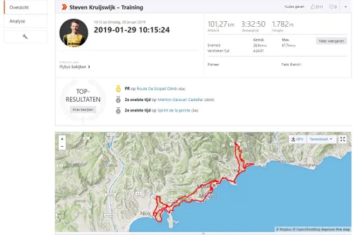 Renners zijn niet altijd even open over hun prestaties, wattages en gegevens, maar Strava biedt bij veel mannen en vrouwen toch uitkomst. Wie reed er records aan puin tijdens trainingen en hoe presteerden de renners in wedstrijden? In de Leiderstrui kijkt in 'Gespot op Strava' wekelijks naar de cijfers achter de prestatie. Deze week: Steven Kruijswijk op weg naar zijn eerste koers van 2019. Chris Froome zakte door het ijs in Colombia, Geraint Thomas is zijn overtollige kilo's zeker nog niet kwijt en Thibaut Pinot maakte zijn favorietenrol maar deels waar in de Tour de la Provence. De eerste favorieten voor de