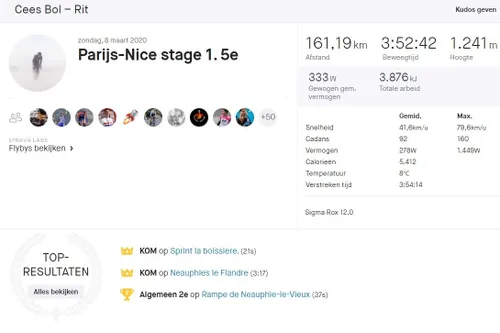 Renners zijn niet altijd even open over hun prestaties, wattages en gegevens, maar Strava biedt bij veel mannen en vrouwen toch uitkomst. Wie reed er records aan puin tijdens trainingen en hoe presteerden de renners in wedstrijden? In de Leiderstrui kijkt in 'Gespot op Strava' wekelijks naar de cijfers achter de prestatie. Deze week: Volle bak koers in Parijs-Nice! Door het coronavirus in Europa worden de wielerfans nog allerminst verwend met wielrennen en de vrees is dat ook de komende weken nog flink zal worden gesneden in de agenda. Niet in