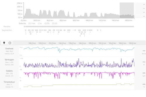In tegenstelling tot de eerste etappe braken de waaiers pas veel later uit, namelijk in de laatste twintig kilometer, dankzij Trek-Segafredo. We selecteren in de Strava-file van Ackermann de laatste twintig kilometer en zien ineens waarom Thibaut Pinot letterlijk uit de eerste waaier werd gereden in de finale. Ackermann haalde richting de finish een gemiddelde van 52,9 kilometer per uur, over twintig kilometer. Zijn max lag op 68,4 kilometer per uur, gek genoeg niet eens eruit geperst in de sprint aan het einde.