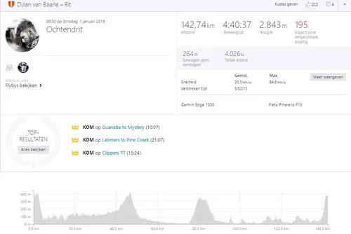 De Hollanders trokken er samen met één of meerdere ploegmaats (alleen Pavel Sivakov zien we ook actief op Strava) op uit in de Australische omgeving. Waar de meeste Nederlanders op 1 januari met een oliebol en een laatste slok champagne het nieuwe jaar in brakten, daar tikten Van Baarle met Sivakov maar meteen 143 kilometer af. Dat is nog eens een start van 2019!
