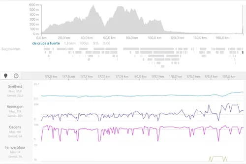 Om tot winst te komen reed hij in de laatste kilometer van de klim 291 watt gemiddeld. Hij haalde een piek van 774 watt. Voor een lichtgewicht van zo rond de 66 kilogram zijn dat niet eens buitengewoon spectaculaire cijfers. 291 watt is 4,4 watt per kilogram, terwijl we bij de echt grote prestaties ook getallen van boven de 6 watt per kilogram zien. Het kan betekenen dat Pogacar niet eens diep hoefde te gaan, dat hij lang in het kielzog kon blijven, dat hij een paar kilo zwaarder is óf dat zijn Strava-gegevens misschien niet kloppen.
