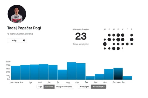 kilometervreter Egan Bernal zijn we ten slotte wel benieuwd wat Pogacar in de winter zoal gedaan heeft om nu al zo in orde te zijn bij zijn eerste aankomst bergop. Bernal trainde in december 3.643,5 kilometer, Pogacar registreerde 'slechts' 1.949 kilometer op Strava in die maand. Wat ook opvalt is dat hij in oktober en november met dik 600 en 1000 kilometer rustig aan deed qua afstanden.