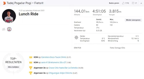 Op 11 februari noteerde Pogacar één KOM, op een segment van 240 meter. Daar stappen we voor nu even overheen, want we kijken graag naar vrijdag 12 februari. Pogacar kende een lange dag, met 150,22 kilometer en maar liefst 3.957 hoogtemeters. Na 5:15:26 kon hij de benen weer laten rusten. Pogacar werkte alles af aan 28,6 kilometer per uur gemiddeld. Persoonlijke records deze dag? Tien. KOM's? Drie stuks in totaal. Het was weer een productief dagje voor meneer Poga.