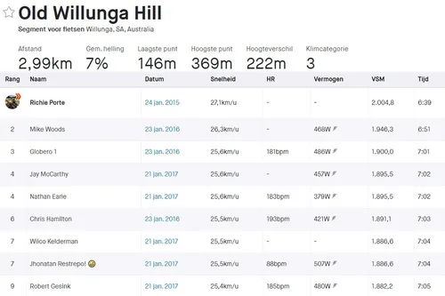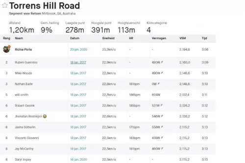 Porte's record stamt uit 2015, toen hij in slechts 6 minuten en 39 seconden boven was. Hij reed toen met een gemiddelde van 27,1 kilometer per uur omhoog. De kloof met de rest op Strava is pijnlijk. Mike Woods staat in het klassement op plek twee. Hij klokte in 2016 een tijd van 6.51 minuten, waarmee hij dus twaalf seconden langzamer was dan Porte.