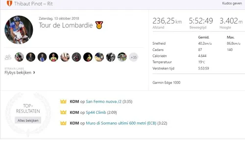 Renners zijn niet altijd even open over hun prestaties, wattages en gegevens, maar Strava biedt bij veel mannen toch uitkomst. Wie reed er records aan puin tijdens trainingen en hoe presteerden de renners in wedstrijden? In de Leiderstrui kijkt in 'Gespot op Strava' wekelijks naar de cijfers achter de prestatie. Deze week: De epische strijd tussen Thibaut Pinot en Vincenzo Nibali in Lombardije. Wie voorafgaand aan
