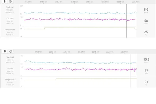 Helaas zien we geen hartslagen, maar daarna is het vol gas naar de meet. Aan de voet van de Ceviglo komen Pinot en Nibali opnieuw samen en blijven ze tot vlak onder de top samen. Pinot ramt tegen 18,4 kilometer per uur door op de stroken van 9 procent, Nibali stort in. Dat zien we onder meer aan de snelheden en cadans, zoals hierboven weergegeven. Vlak onder de top zien we Nibali (de bovenste grafiek) ineens zwaarder trappen en zijn snelheid loopt terug van 17 á 18 kilometer per uur naar 10 en op zijn laagst zelfs 8,6 kilometer per uur. Pinot (de onderste grafiek) slaat snel een gat, want die houdt op hetzelfde terrein zijn tempo van 15 á 17 kilometer per uur vol. Hij bleek de man met de langste adem.