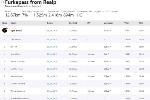 Op de eerste en tweede klim van de dag hield Bernal zich nog in, maar op de derde liet hij nog eenmaal de benen spreken. De Furkapass van 12,87 kilometer bedwong hij in 35:57 minuten. Met 312 watt gemiddeld was hij 29 seconden sneller dan de nummer twee in het nieuwe KOM-klassement; Tiesj Benoot.
