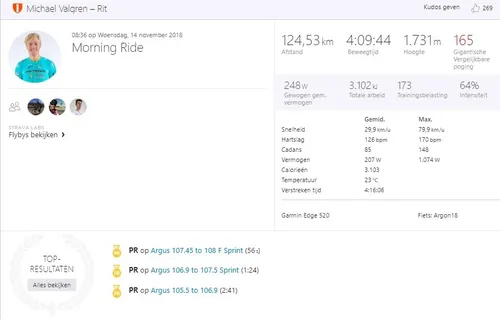 Valgren heeft duidelijk zin in het nieuwe seizoen, want ook wie kijkt naar zijn rit-inhoud kan niet anders concluderen dan dat de benen al lekker warmdraaien. Een rit van 124,5 kilometer met 1.731 hoogtemeters wordt met een door Strava geschat gemiddeld vermogen van 248 watt afgelegd. De gemiddelde snelheid van zo'n trainingsritje? 29,9 kilometer per uur. En dan in de wetenschap dat zijn gemiddelde hartslag 126 slagen per minuut bedroeg. Hal-lo 2019!