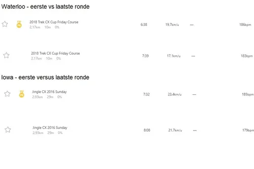 Vooral in Waterloo deed hij dat met een hartslag die maar amper onder de 190 kwam. In Iowa lijkt dat wat beter voor elkaar, maar dat komt vooral omdat de rondetijden snel opliepen. Gaf hij zich gewonnen? Of wilde hij zich niet in het rood rijden? Net als in Waterloo reed hij in de laatste rondes ten opzichte van de eerste rondes een halve minuut tot een minuut langzamer. Juist die rondetijden vlak houden, is een kwaliteit van bijvoorbeeld Van der Poel.