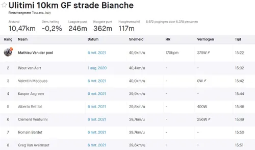 Strade Bianche en hier zijn de verschillen al wat kleiner. Van der Poel pakte de KOM door de laatste tien kilometer in 15 minuten en 22 seconden af te leggen. Nummer twee in die lijst blijft Van Aert, die in 2020 10 seconden langer deed over dit segment. Het geeft aan dat Van Aert vorig seizoen ook ongelofelijk hard reed in de finale, maar dat de sterke kopgroep en Van der Poel de finale in 2021 simpelweg eerder openden. Na Van Aert uit 2020 zijn de toptijden bij deze KOM namelijk louter uit de editie van 2021.