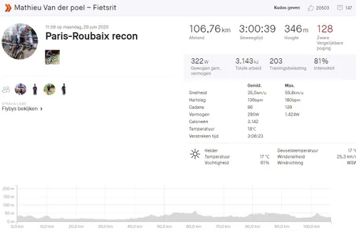 Op maandag tijdens de verkenning hadden Van der Poel en Alpecin-Fenix goed weer en dus werd de gashendel eens goed ingetrapt. 106,76 kilometer werd afgeraffeld in drie uur tijd, goed voor een gemiddelde van 35,5 kilometer per uur. Aan de cijfers van Van der Poel zien we dat hij zich op sommige stroken eens lekker heeft uitgeleefd. Met een maximale hartslag van 180 slagen per minuut was het zeker geen duurritje en het maximale wattage van 1.424 watt, daar nemen we onze hoed voor af. Gemiddeld denderde Van der Poel aan 290 watt gemiddeld over het parcours.