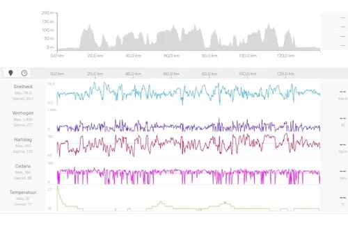 Van der Poel zelf hield zich iets meer gedeisd met een maximale hartslag van 176 slagen per minuut en een piek van 998 watt. Een gemiddelde van 267 watt is nog steeds keurig, ruim boven de 4 watt per kilogram gemiddeld. In totaal tellen we dertien persoonlijke records voor de alleskunner. Dat is nogal wat, als we bedenken dat Van der Poel vorig jaar in de 'echte' Gent-Wevelgem lang mee was in een heuse waaier-klassieker.