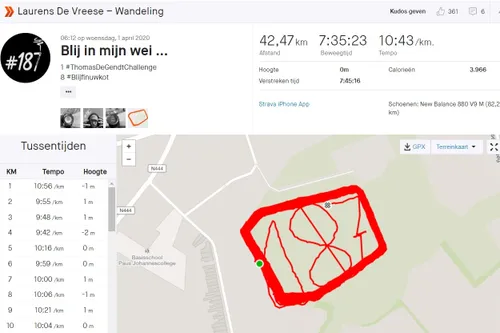 Dat De Vreese totaal geen moeite heeft met een eenzijdige training, bleek al wel uit het feit dat hij de 368,94 kilometer op zijn thuistrainer aflegde op steeds hetzelfde virtuele rondje. Ook tijdens zijn wandelsessie liep hij rond, constant op dezelfde route. Althans, hij nam nog wel de moeite om in zijn indrukwekkende rechthoek een kunstwerk te maken. 187 staat dan weer voor zijn rapnaam LDV187.
