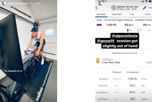 En dan is er nog Mathieu van der Poel. De Nederlander rijdt doorgaans zijn rondjes buiten, zonder Strava. Maar dat wil niet zeggen dat we helemaal niets te zien krijgen van de alleskunner. Op 29 maart trok Van der Poel er een uurtje op uit op zijn thuistrainer en een uur later moest hij toegeven dat het 'een beetje uit de hand was gelopen'.