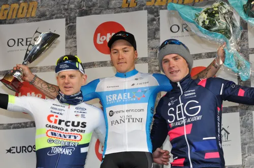 David Dekker (rechts op de foto) op het podium van Le Samyn. (Foto: Sirotti, 2020) Dekker kiest voor sprintervaring van Jumbo-Visma: 'Ze weten hoe het moet'