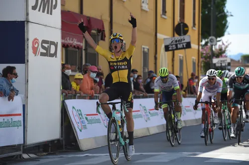 Olav Kooij wint met overmacht de eerste etappe van de Coppi e Bartali. (Foto: Sirotti, 2020) Jumbo-Visma wil met Kooij winnen in 'kleinere koersen'