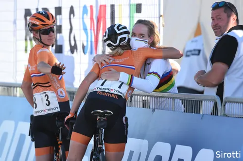 V.l.n.r.: Amy Pieters, Demi Vollering en Anna van der Breggen (WK wielrennen, Imola 2020) Vollering hoopt van harte dat er inderdaad nog nieuwe