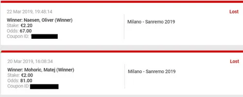 'Oei, met deze vraag raak je een gevoelige snaar! Vorig jaar had ik (letterlijk) mijn geld gezet op Matej Mohoric (een odd van 81) en Oliver Naesen (odd van 67). Mohoric viel net onder de rode vod aan, werd teruggepakt door volgens mij Van Aert en werd uiteindelijk vijfde. Naesen finishte nipt als tweede achter Alaphilippe. Man, wat heb ik die twee vooruit geschreeuwd.'