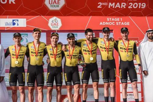 2019 was hét jaar van Jumbo-Visma. Overal was de supermarktformatie prominent aanwezig en vele zeges werden bijgeschreven op het conto van de ploeg. Dat begon in de Verenigde Arabische Emiraten, waar de ploeg de ploegentijdrit en het eindklassement naar zich toetrok, met Primoz Roglic.