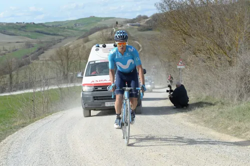 Hij staat nog niet zo lang op de kalender, maar o wat is de Strade Bianche toch een formidabele koers. Julian Alaphilippe won dit jaar, voor Jakob Fuglsang. Maar ook in de achtergrond wordt er gestreden om de tijdslimiet te halen. Op de foto cultheld Carlos Bananito Betancur voor de bezemwagen. De Colombiaan finishte als laatste in de klassieker, maar kon wel genieten van de prachtige omgeving rond Siena.