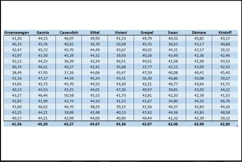 Het is wat dat betreft niet gek dat de gemiddelde snelheid van Gaviria er zover bovenuit steekt, de Colombiaan heeft bij Quick-Step Floors een haast perfecte sprinttrein tot zijn beschikking. Wat hem na een afmattende koers frisser naar de laatste driehonderd meter kan brengen. Ook Viviani, Kittel en Cavendish (boven de 43 km/h) zijn sprinters die doorgaans meer op hun trein (kunnen) leunen dan Démare, Greipel, Kristoff en Ewan (onder de 43 km/h). En is het toeval dat het kwartet boven de 43 km/h allemaal bij de goed geoliede formatie van Patrick Lefevere rijden of hebben gereden?