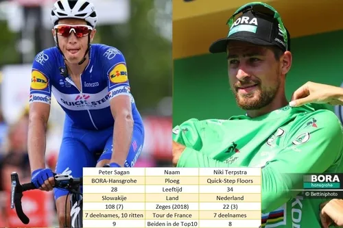 Het is oneerlijk om de zeges van Sagan (108) en Terpstra (22) naast elkaar te leggen. In het dagelijks leven is Sagan immers kopman en sprinter van beroep, terwijl Terpstra zich wat meer wegcijfert in dienst van een sprinter en om te winnen eigenlijk altijd solo aan moet komen. Alleen in het voorjaar is dat anders. Als je kijkt naar het aantal keer dat ze beiden in de top10 finishten – iets dat je zondag zeker mag verwachten – zijn de verschillen veel kleiner. Dan is Sagan negen keer in het voordeel tegenover acht keer Terpstra.