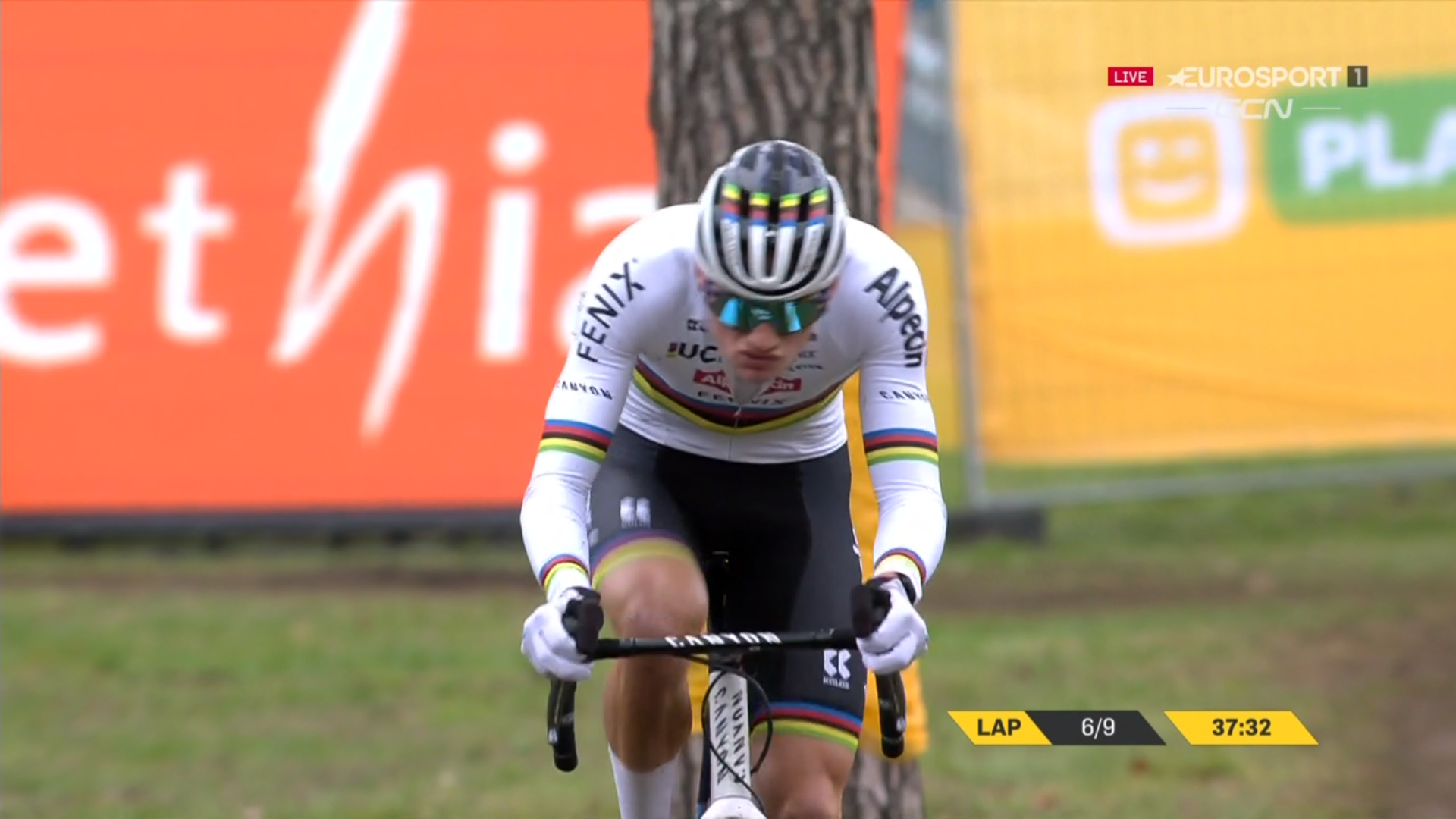 In het flashinterview doet Van Aert zijn verhaal. 'Nog voordat ik vanwege mijn lekke band mijn fiets had gewisseld, had ik al beslist dat ik er het beste uit wilde halen.' Dat bleek dus een tweede plek, ver van leider Van der Poel. Van Aert is er content mee. 'Ik had goede benen, en ben op een zuinige manier tweede geworden. Ik heb niet alles hoeven geven.'