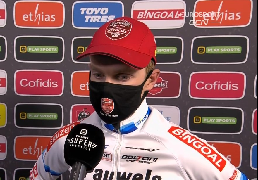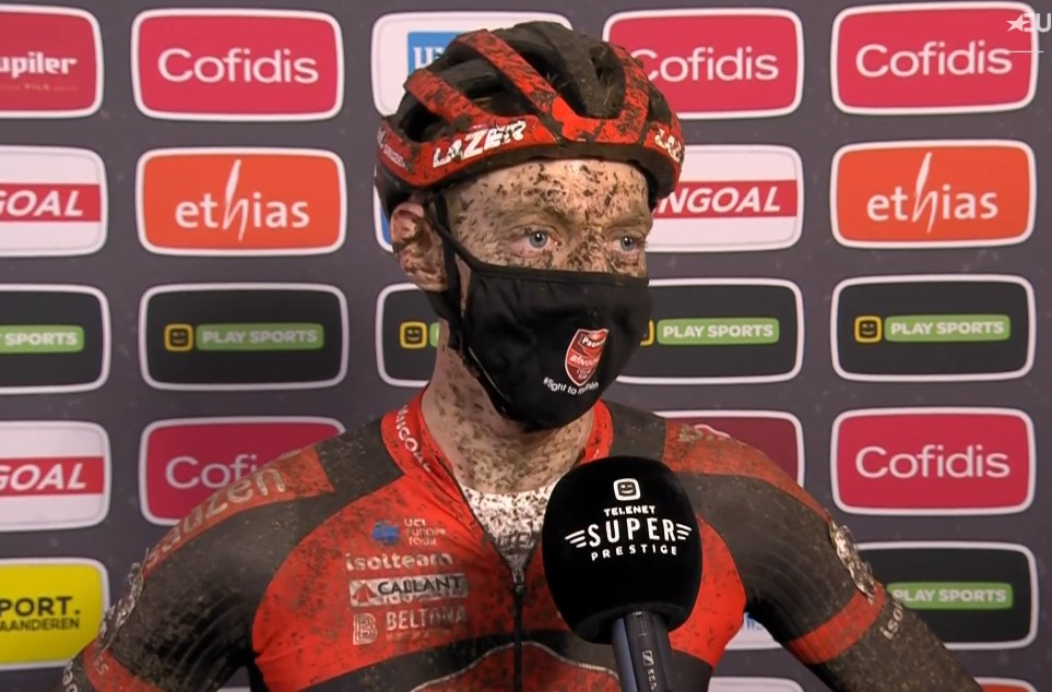Laurens Sweeck. Eli Iserbyt was tegen de grond gegaan, waardoor hij niet meer met de voorste renners meedeed.