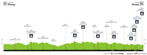 Redelijk in het begin van de koers moet het peloton de Mûr-de-Bretagne op. Een indrukwekkende klim, maar in dit stadium van de koers is het voornamelijk voor de show. Het zwaartepunt moeten we echt zoeken in de staart, want in de laatste 25 kilometer vinden de renners de combinatie Kerhoat-Restergal-Côte du Lezot-Resterbag, waarna het nog maar twee kilometer tot de streep is. Als er daar gas wordt gegeven gaan er dus sowieso gaten ontstaan.