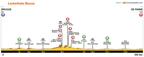 De Driedaagse Brugge - De Panne gaat woensdag over 202,4 kilometer. Na twee zware kasseienstroken van respectievelijk tweeduizend en twaalfhonderd meter, krijgen de renners de Monteberg, de Kemmelberg, de Rodeberg, de Vidaigneberg en de Sulferberg voor de kiezen. Eenmaal in De Panne aangekomen volgen er nog twee lokale ronden van 25 kilometer waar waarschijnlijk gesprint zal worden voor de overwinning.